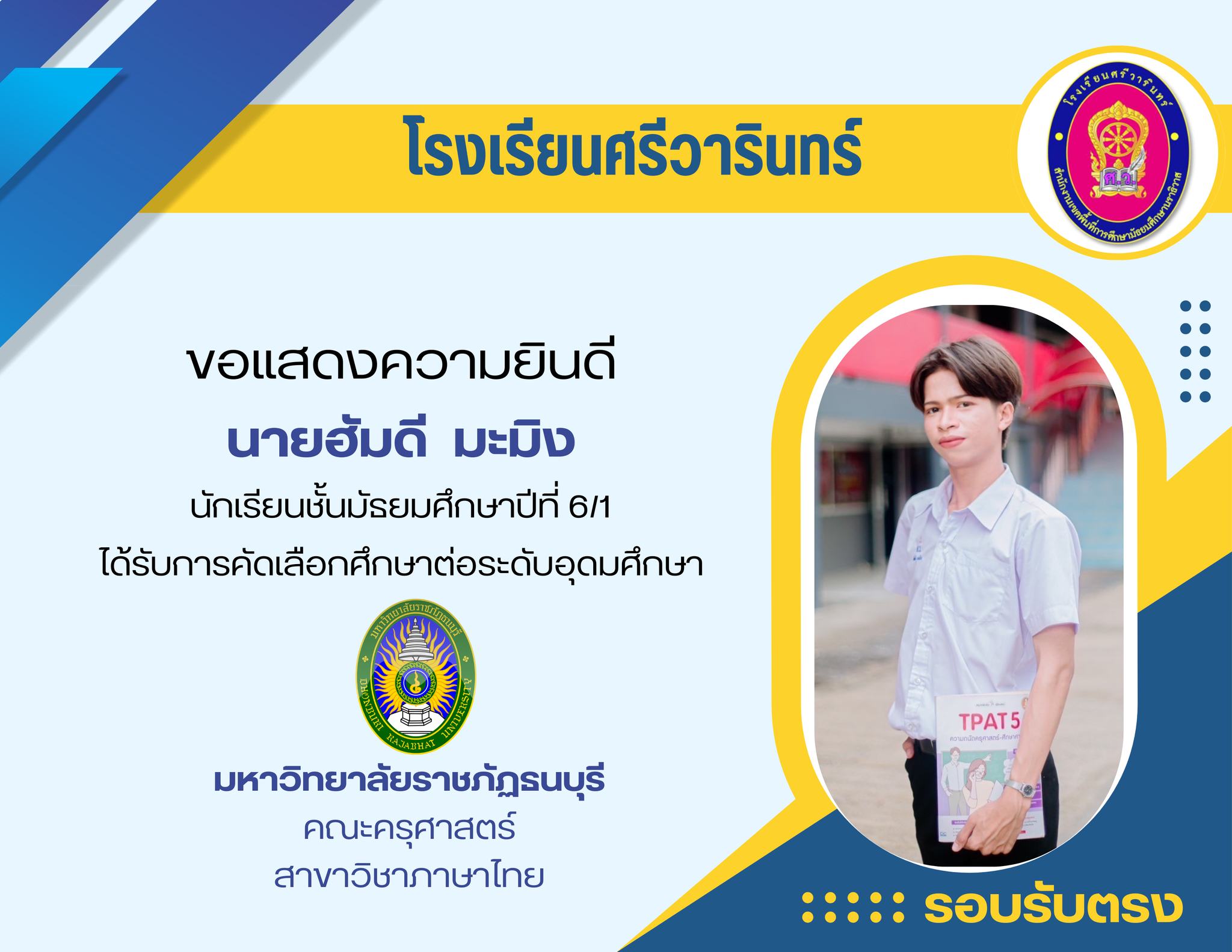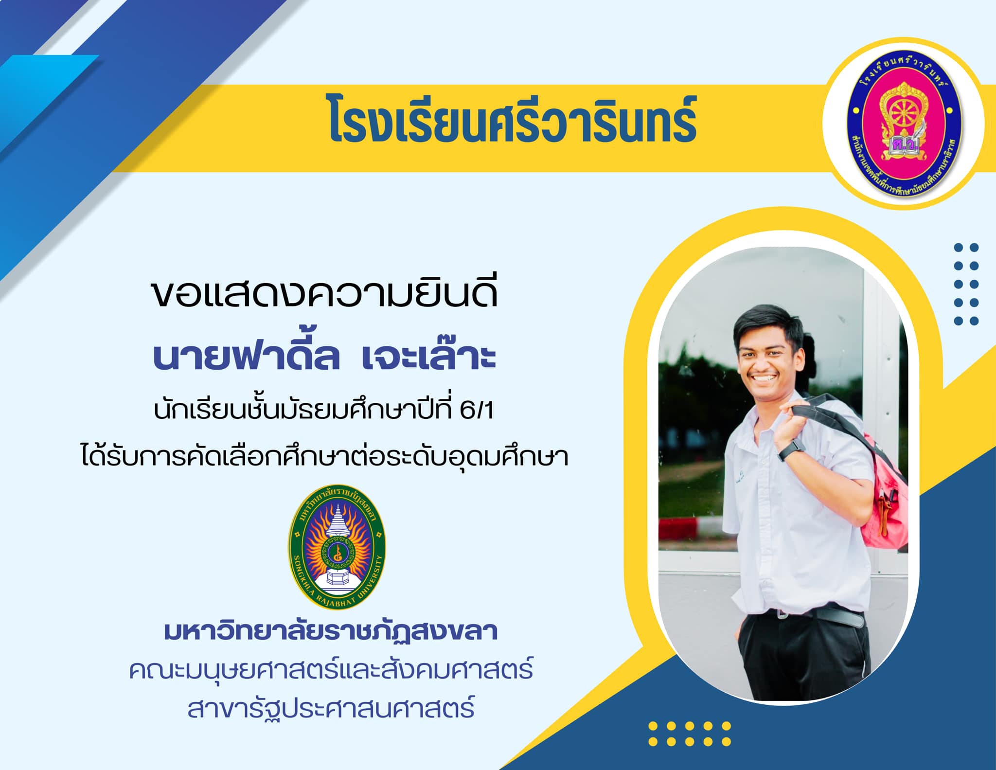 ประดับปลอกแขนคณะกรรมการสภานักเรียนโรงเรียนศรีวารินทร์ 08/01/2025 ข่าวโรงเรียน สดุดีวันสุนทรภู่เคียงคู่ภาษาไทยภาษาชาติ 08/01/2025 ข่าวโรงเรียน นิทรรศการทุนพระราชทาน ม.ท.ศ. ในงานเฉลิมพระเกียรติพระบาทสมเด็จพระเจ้าอยู่หัว 08/01/2025 ข่าวโรงเรียน แข่งขันกีฬาสานสัมพันธ์ (ศรีวารินทร์เกมส์ ต้านภัยยาเสพติด) 08/01/2025 ข่าวโรงเรียน งานแนะแนว และระบบการคัดเลือก TCAS 08/01/2025 ข่าวโรงเรียน อาเก๊าะในเดือนรอมฎอน 08/01/2025 ข่าวโรงเรียน วันอาสาฬหบูชาและวันเข้าพรรษา ประจำปี 2568 08/01/2025 ข่าวโรงเรียน การบรรยายคุณธรรม จริยธรรม วิถีมุสลิมในศตวรรษที่ 21 08/01/2025 Uncategorized การประเมิน “สุขาดี มีความสุข” 08/01/2025 ข่าวโรงเรียน ส่งเสริมการพัฒนาทักษะอาชีพเพื่อการมีรายได้ 08/01/2025 ข่าวโรงเรียน จำนวนคนดู : 4,879